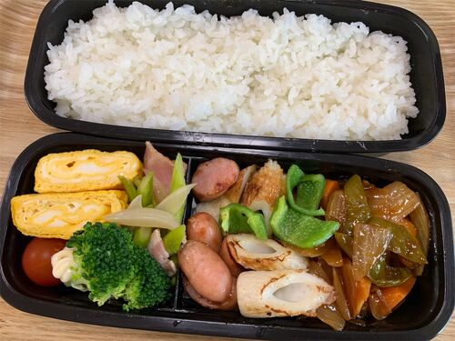 酢豚 ちくわとウィンナーとピーマンの炒め物 アスパラとベーコンと玉ねぎの炒めもの 卵焼き ブロッコリー ミニトマト ごはん