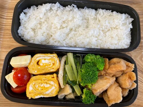 からあげ ブロッコリー 卵焼き ミニトマト チーズ 小松菜と豆苗とあげの煮物(長男) おにぎり(三男) ごはん(長男)