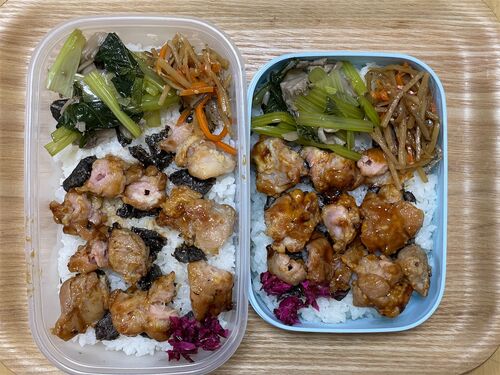 焼き鳥丼 しば漬け 小松菜と舞茸の煮物 ごぼうとにんじんのきんぴら