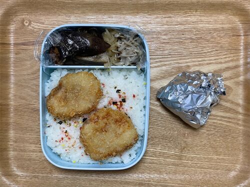 ごはん 辛子明太子ふりかけ ひとくちヒレカツ(妻) ロースカツ(長男、次男) 砂ずりのいためもの 焼きなす 切り干し大根の煮物 エノキと舞茸の中華風酒蒸し 焼き芋