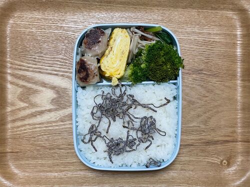 ごはん 塩昆布 焼きシウマイ ビーフメンチ(長男、次男) 卵焼き 小松菜とエノキのポン酢和え ブロッコリー