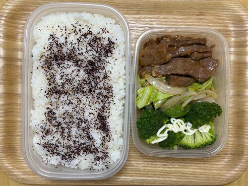 ごはん 梅しそふりかけ(次男) 卵焼き ブロッコリーのおかか和え 豚肉とトマトのカレー(妻) 唐揚げ(次男) 小松菜とウインナーの炒め物(次男)