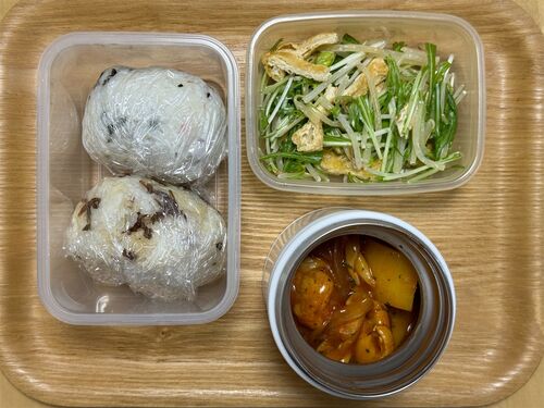 おにぎり(梅しそ、いかなご) 鶏肉のトマト煮 水菜ともやしのはりはりサラダ