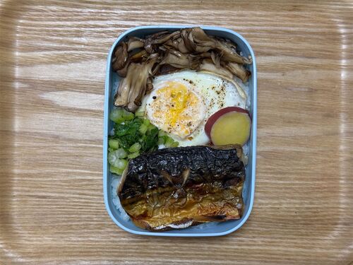 ごはん 目玉焼き 鯖の塩焼き セロリの炒め物 さつまいもの甘露煮 舞茸のポン酢炒め