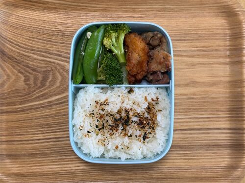 ごはん おかかふりかけ ロピチキ 焼き鳥 ブロッコリーの玉ねぎドレ和え 茹でスナップエンドウのマヨ添え